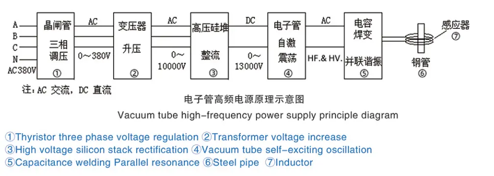 সাধারন ইন্ডাস্ট্রিয়াল এসি (চীনে থ্রি-ফেজ ফোর ওয়্যার 380V/50HZ) থাইরিস্টর এসি ভোল্টেজ রেগুলেটরের মাধ্যমে 0 থেকে 380V (ফ্রিকোয়েন্সি অপরিবর্তিত) পর্যন্ত অ্যাডজাস্টেবল এসি-তে রূপান্তরিত হয় এবং তারপরে প্রায় 10000V হাই ভোল্টেজ পর্যন্ত ধাপে ধাপে ধাপে ধাপে 10000V উচ্চ ভোল্টেজ (একটি ফ্রিকোয়েন্সি দ্বারা পরিবর্তন করা হয়) ভোল্টেজ রেকটিফায়ার সার্কিট হাজার হাজার হাই ভোল্টেজ ডিসিতে, এবং তারপর ভ্যাকুয়াম টিউব দ্বারা এইচএফ এবং এইচভি কারেন্টে দোদুল্যমান, এবং তারপরে LC সমান্তরাল অনুরণনের মাধ্যমে দোদুল্যমান কারেন্টকে প্রশস্ত করার জন্য, এবং ইস্পাত পাইপ এবং অন্যান্য ওয়ার্কপিস ইত্যাদি গরম করার জন্য ব্যবহৃত ইন্ডাক্টরকে ভোল্টেজ হ্রাস করার পরে সরবরাহ করা হয়।